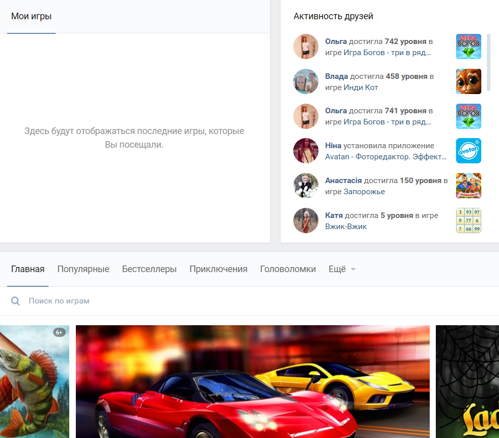 Кликаем на фунцию «Игры» и перед нами открывается страница где показаны ваши игры, «Активность ваших друзей» в приложениях вконтакте. Так же тут можно найти, или выбрать из предложенных приложений то, что будет вам интересно.