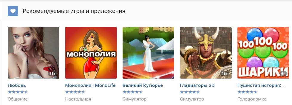 Перемещаясь вниз по странице отображаются рекомендации. Рекомендованные для вас приложения вконтакте предлагают на основании активности ваших друзей, а так же игр, в которых вы зависаете.