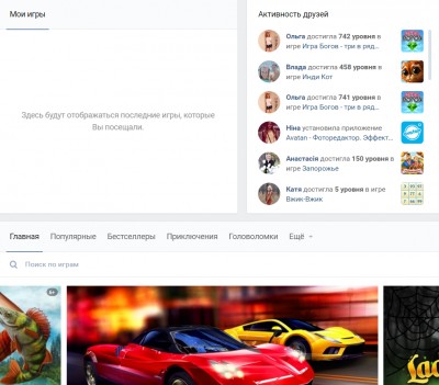 Под строкой поиска у нас есть помощь в выборе приложений вк, а именно создатели разделили их по рубрикам. Мы можем видеть самые популярные игры в контакте в первой вкладке и перемещаясь дальше увидеть еще много интересного.